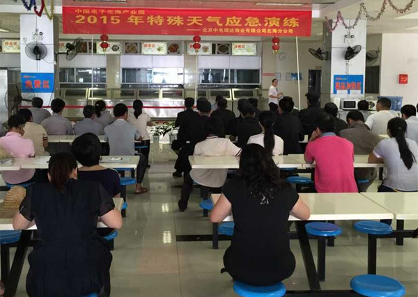 因北海天氣多變,特殊天氣隨時(shí)可能發(fā)生,為防止隨時(shí)可能出現(xiàn)的特殊天氣對(duì)園區(qū)安全帶來(lái)不利影響,確保園區(qū)設(shè)備財(cái)產(chǎn)的正常運(yùn)轉(zhuǎn)、安全,確保園區(qū)安全生產(chǎn)零事故,同時(shí)為讓員工熟悉應(yīng)對(duì)特殊天氣的工作流程,做到工作有計(jì)劃性、準(zhǔn)備工作及時(shí)到位、突發(fā)事件處理及時(shí),園區(qū)物業(yè)公司(中電瑞達(dá))于2015年6月9日下午,組織公司全體人員開(kāi)展了一次特殊天氣應(yīng)急演練。整個(gè)演練分為:特殊天氣應(yīng)急預(yù)案培訓(xùn)、特殊天氣應(yīng)急演練兩大部分。為確保此次演練順利進(jìn)行,物業(yè)公司積極準(zhǔn)備,專門(mén)組織各部門(mén)負(fù)責(zé)人召開(kāi)專題會(huì)議,完善方案、物資準(zhǔn)備,部署每個(gè)演練環(huán)節(jié),明確人員分工、時(shí)間節(jié)點(diǎn)、演練流程。
